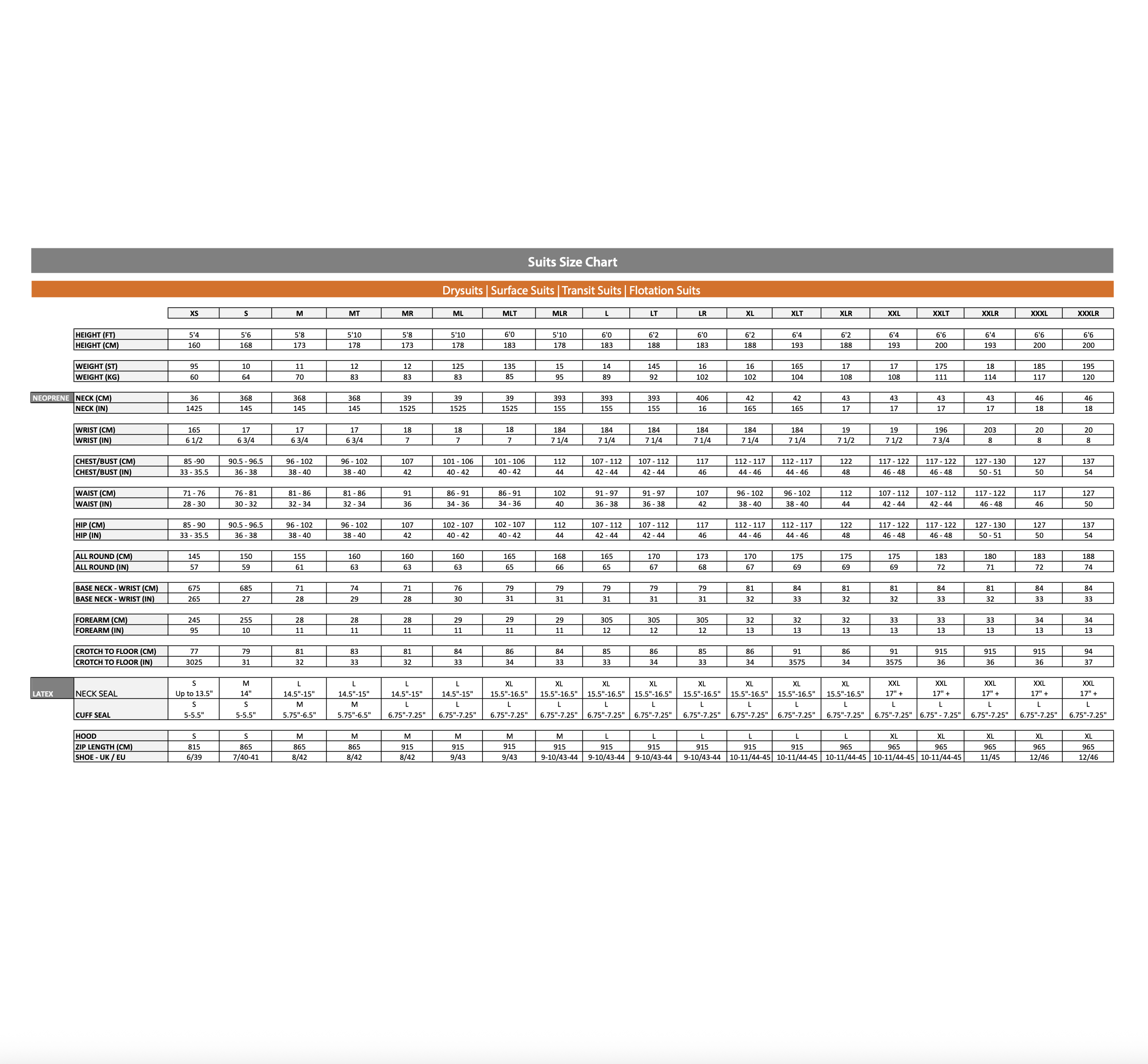 We can make alterations to the drysuit if these standard sizes of seals and footwear won't fit you.