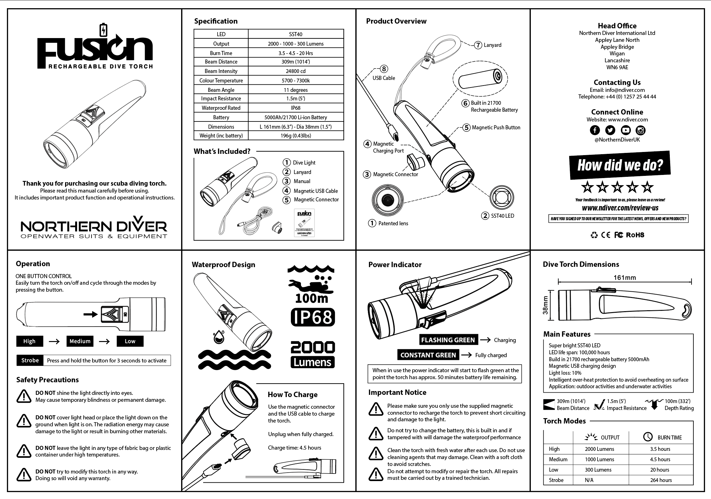 Fusion rechargeable dive torch. I bought this torch as I'd left my primary torch on the bottom of the North sea and needed a replacement. I recently used it at 8acres lake near Goole, there was pretty bad visibility during the day, I also used it on a night dive on the same day. I used the torch on full setting for over 2 hours, I was very pleased with it's performance and had no problem seeing or being seen whilst using it. It's easy to use, no problems with the slide button for off and on, nice weight to it, good size so it doesn't get in the way. I ordered it next day delivery, it arrived as expected.