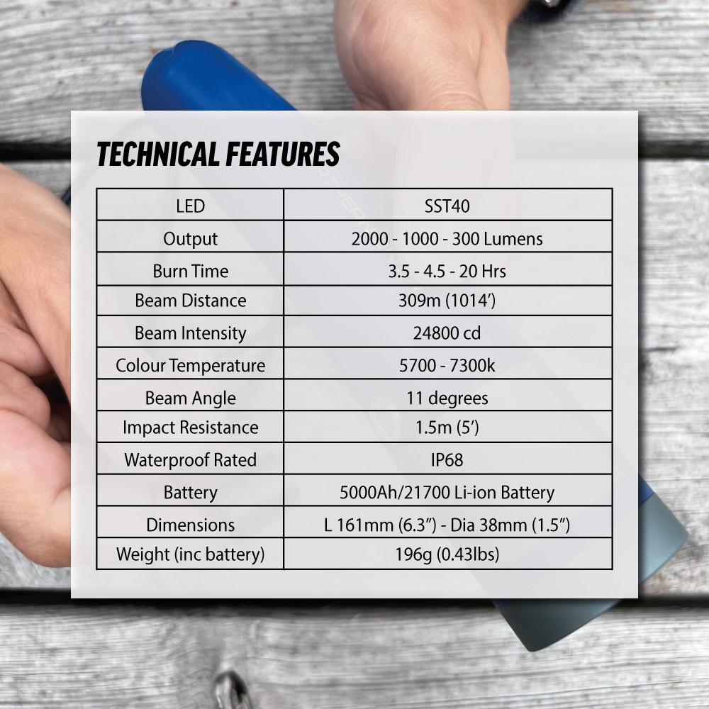 - LED: SST40 | Output: 2000 - 1000 - 300 lumens | Beam Intensity: 24800 cd